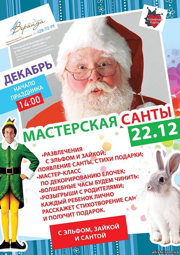 С Эльфом, Зайкой и Сантой В программе: - Развлечения с Эльфом и Зайкой; - Появление Санты, стихи подарки; - Мастер-классы по декорированию елочек; - Волшебные часы будем чинить; - Розыгрыши с родителями. Каждый ребенок лично расскажет стихотворение Санте и получит подарок.
