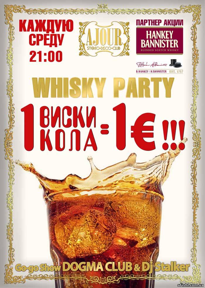 Текст объявления: Каждую среду, в ночном клубе «Ажур» на вечеринке «Whisky Party», отличная дружеская атмосфера, хорошие dj's и веселая музыка!