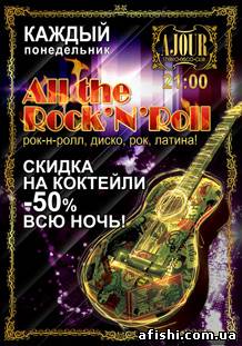 Если в сердце стучат ритмы рок-н-ролла, диско и рока, ночной клуб «Ажур» приглашает тебя на безумно энергичную вечеринку «All thе Rock’n’roll»! Под звуки рок-н-ролла невозможно устоять! Ноги сами несут тебя на танцпол! Рок-н-ролл жив, рок-н-ролл есть, рок-н-ролл будет жить всегда! Супер акция - всю ночь скидка на коктейли 50%!!! Для вас играют: Dj Smart-Boy&Friends! Начало в 20:00 FACE CONTROL|DRESS CODE С 23:00 платный вход: мужчины – 100грн., (цена включает в себя коктейль на выбор по пожеланию гостя), девушки – бесплатно (+ подарочный коктейль «Red Bull»-водка) Информация и резерв столиков по телефону: (044) 234-74-94 г.Киев, ул. Леонтовича, 3 http://www.avalon.ua/ |