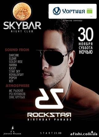 Ты когда-нибудь видел столько dj в одном месте собравшихся по одной и той же причине? Ты до сих пор думаешь, что это невозможно? DJ Rockstar приглашает на свой BirthdayParade в SKYBAR! Встречай первую зимнюю субботнюю ночь под сеты от друзей именинника: Darchik, Eldar,GoldyRise, Hanna, Kasey, StarSky, Kovalevsky, Popov, Key! DJRockstarBirthdayParade – вечеринка для тех, кто к теме! Atmosphere: МС Рыжий PDJ Куликов DMCКрутых