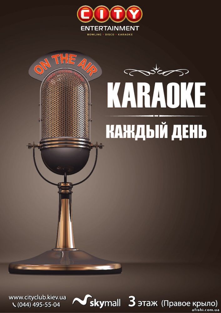 Текст объявления: Караоке - поем и веселимся в дружеской компании! Вы удивитесь не только от увиденного, но и от услышанного! Здесь по-настоящему особенная атмосфера и каждый вечер не похож на другой. Подробнее - http://cityclub.kiev.ua/karaoke • Резерв столов по тел: (044) 495-55-24 - reception (044) 495-55-04 - администратор Одевайся красиво! На входе действует Face Control & Dress Code. Местоположение: Киев, проспект Генерала Ватутина 2-Т, ТРЦ "Скай Мол", 3 этаж. http://www.cityclub.kiev.ua