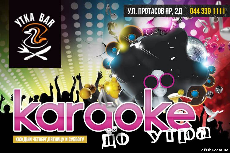 Каждый четверг, пятницу и субботу в ресторане «Утка Bar» Вы получаете возможность перенестись в эйфорический мир музыки, открыть новые таланты и почувствовать себя "настоящей звездой эстрады"! Новая акустическая аппаратура караоке, оборудованная по последнему слову техники. Профессиональный звукорежиссер и вокалистка. Приятные подарки и сюрпризы для лучших исполнителей. <br /><br /> Пой вместе с нами! <br /><br /> Вход: Чт.-50 грн.,Пт.,Сб.-100 грн. |