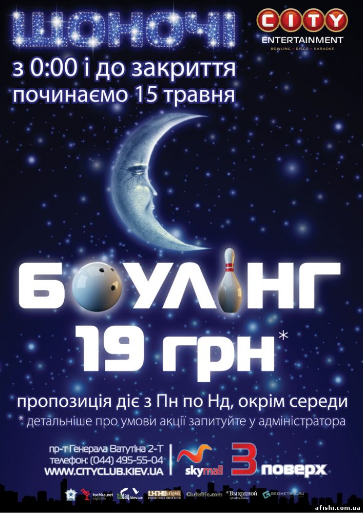 Боулинг клуб City Entertainment ставит единую цену на боулинг ночью — 19 гривен за час игры.
