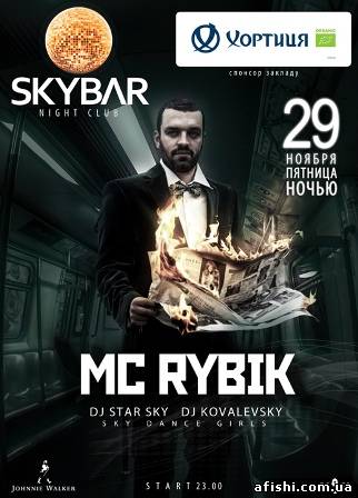 «Играет музыка, дребезжат колонки, влюбляйтесь тихо, любите громко!» - автор этих и многих других афоризмов клубной жизни MC RYBIK сегодня раскачает вас! Резидент ростовского «Park Культуры» и одесской «Ибицы». По будням – шеф-редактор журнала MAXIM в Украине. Он говорит то, что думает, но думает, что говорит. Это будет твоя самая горячая пятница! Приходи и наслаждайся без рамок, ограничений и цензуры! DJKovalevsky DJSrarSky Sky Dance Girls
