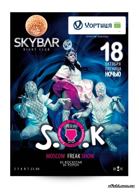 Moscow Freak Show – воплощение лучших неожиданных, экстравагантных и неповторимых образов! Авангардное шоу пластики, музыкального действа – станут частью танцевальной программы, а затем… Вашей неотъемлемой частью! Сужение границ и расширение пространства со скоростью света погружает в мир фантазий и иллюзий, завлекая Вас в игру с разумом! Moscow Freak Show превратит ваш отдых в театральное развлечение и игру без правил! DJ ROCKSTAR, DJ POPOV Начало в 23:00 Reserve: 044 223 88 88 www.skybar.ua |