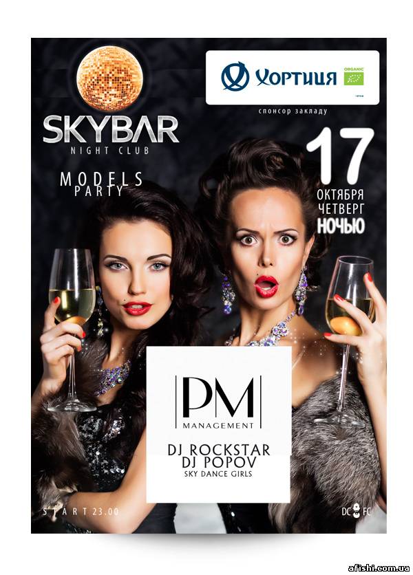SKYBAR & PM MANAGMENT представляет яркий и незабываемый проект, который соберет лучших моделей самого успешного модельного агентства Украины! В этот вечер рядом с вами только самые роскошные и сексуальные девушки столицы! На вечеринке «Models Party» чувства гостей подогреваются только лучшими эксклюзивными коктейлями, а атмосферу красоты дополняют зажигательные миксы от резидентов SKYBAR: DJ ROCKSTAR, DJ POPOV SKY DANCE GIRLS! Погружайся в атмосферу красоты с самими яркими и стильными личностями Украины, WELCOME TO SKYBAR! Начало в 23:00 Reserve: 044 223 88 88 www.skybar.ua |
