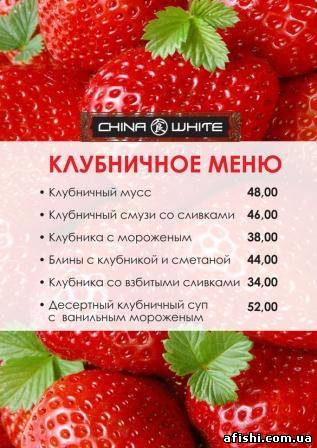 Лето – это пора наслаждений и нет более вкусной и одновременно романтичной ягоды, чем клубника. Именно поэтому ресторан China White приготовил для своих гостей невероятно привлекательное клубничное меню. Приятнее свежей, сочной клубники с мороженым в жаркий день может быть разве что легкий и воздушный клубничный мусс, или клубничный смузи со сливками. Тем, кто желает не просто насладиться вкусом десерта, но и слегка подкрепится, мы рекомендуем аппетитные блины с клубникой и сметаной. Любители ягодной экзотики обязательно оценят десертный клубничный суп. А клубника со взбитыми сливками – это просто классика, от которой невозможно отказаться! Наслаждайтесь клубничным меню в ресторане China White! Ждем Вас!