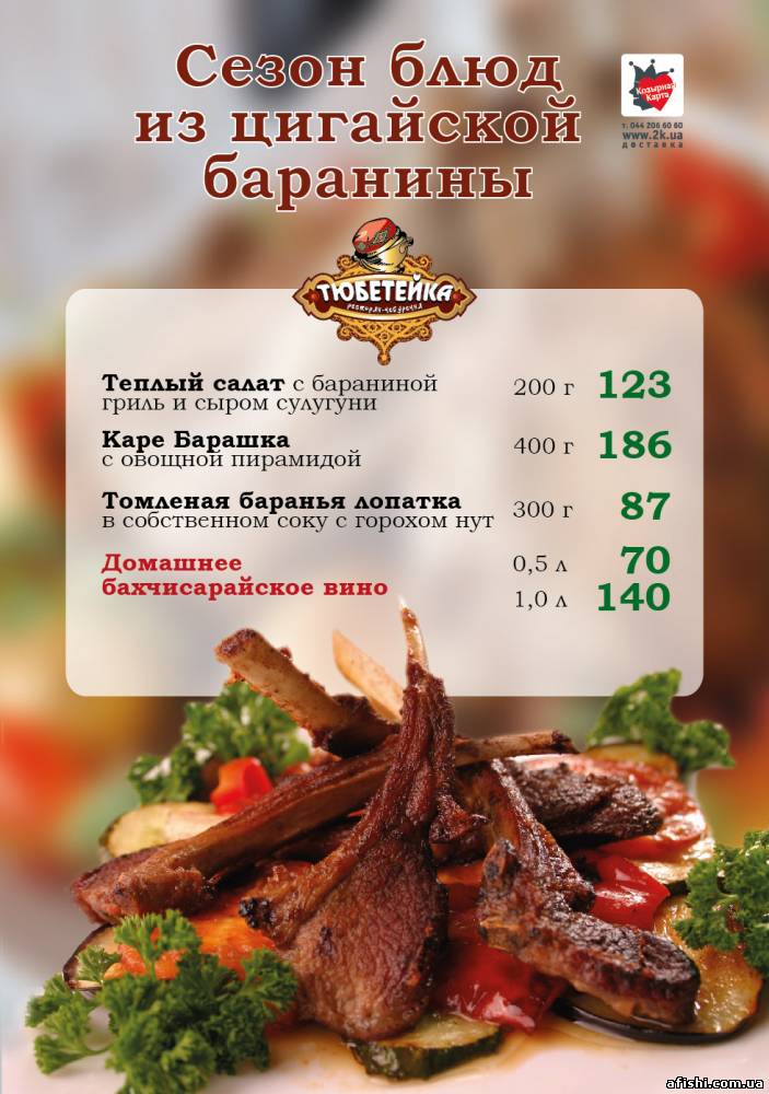 Еще с древних времен овцы ценятся за их нежное и душистое мясо. Многие народы мира используют баранину в своих кухнях, но особенно ценят это мясо народы Востока. Продолжая славную и очень вкусную традицию, ресторан «Тюбетейка» на Тарасовской приготовил для своих гостей специальное предложение! Встречайте сезон блюд из цигайской баранины! Попробуйте невероятный теплый салат с бараниной-гриль и сыром сулугуни. Каре барашка с овощной пирамидой, а также и томленая в собственном соку баранья лопатка с горохом нут покорят сердца и желудки даже самых взыскательных гурманов! Не секрет, что баранина замечательно сочетается с винами, поэтому, рекомендуем домашнее бахчисарайское вино, которое подчеркнет насыщенный вкус и аромат блюд из этого мяса. Наслаждайтесь блюдами из цигайской баранины в «Тюбетейке» на Тарасовской! Ждем Вас!