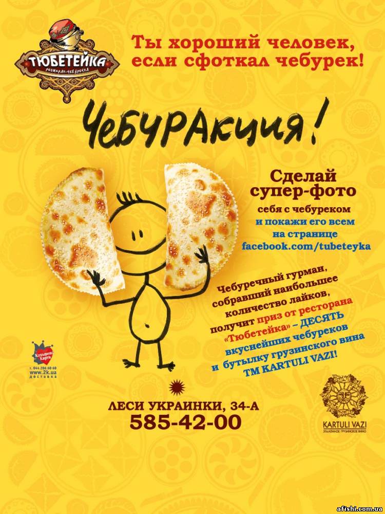 Ресторан «Тюбетейка» на Печерске для всех позитивно настроенных ценителей чебуреков объявляет увлекательный конкурс! До 15 ноября сделай супер-фото себя любимого с любимым чебуреком и покажи его всем на официальной странице «Тюбетейки» на Facebook (facebook.com/tubeteyka). Чебуречный гурман, собравший наибольшее количество «лайков» получит аппетитный подарок – десять вкуснейших чебуреков и бутылку вина ТМ «KARTULI VAZI»! Ты хороший человек, если сфоткал чебурек! Ждем Вас и Ваши фотошедевры!